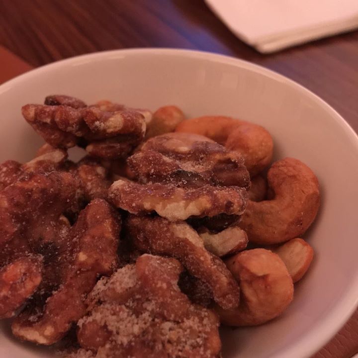 Peppering our "Salad of red oak, frisee, coral lettuces garnished with endive, toasted walnut and dried cranberry". Much effort put into the menus!